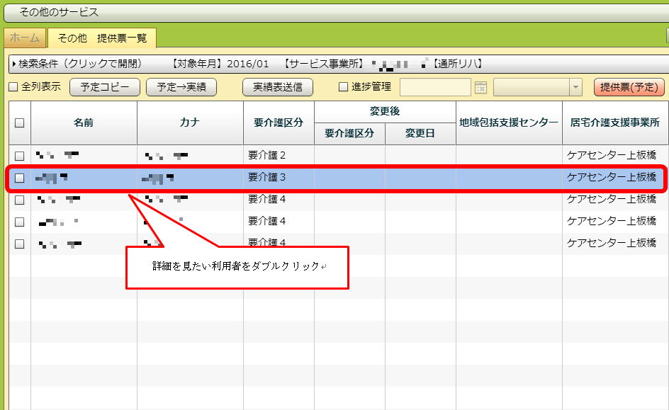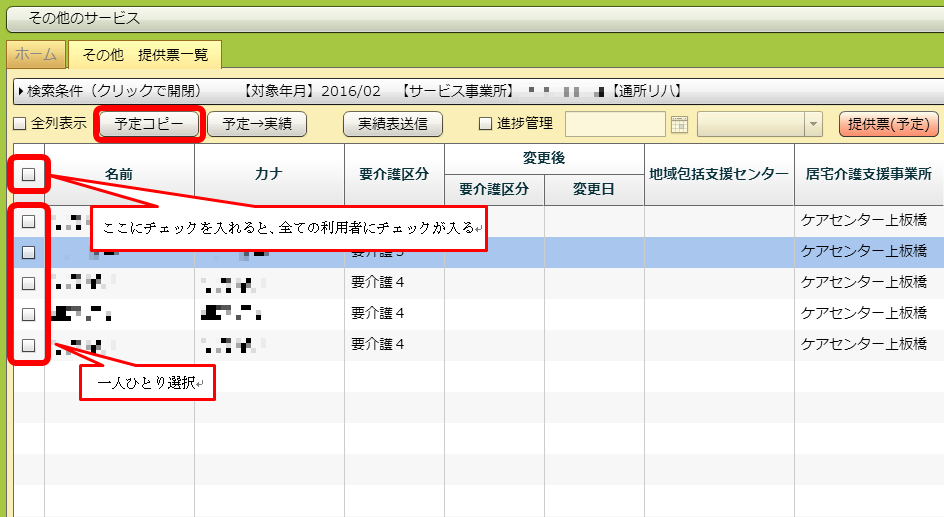 「名前」「カナ」などの項目名が書いてある列にあるチェックボックスをクリックすると、全件にチェックが入ります。その後「予定コピー」ボタンを押すことで、チェックが入った全ての利用者の先々月の実績から今月の予定を作成することができます。