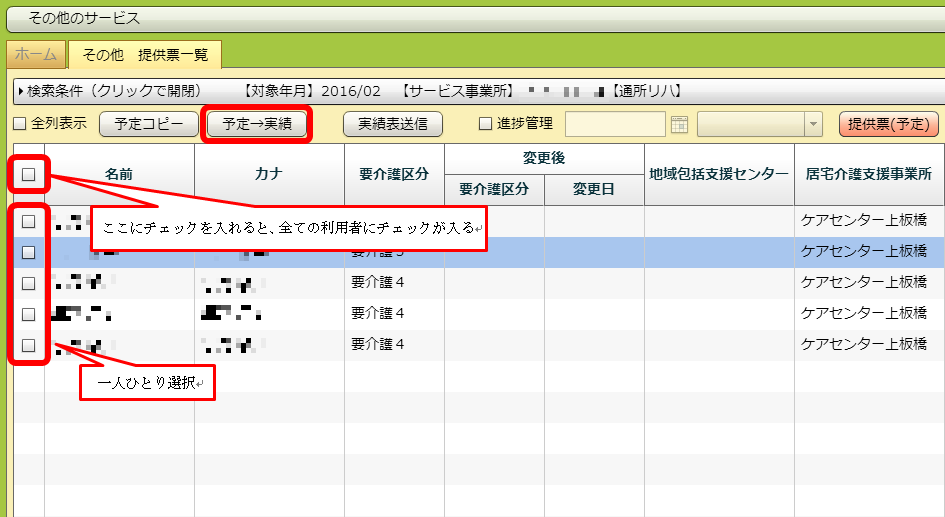 「名前」「カナ」などの項目名が書いてある列にあるチェックボックスをクリックすると、全件にチェックが入ります。その後「予定→実績」ボタンを押すことで、チェックが入った全ての利用者の予定をそのまま実績として登録できます。