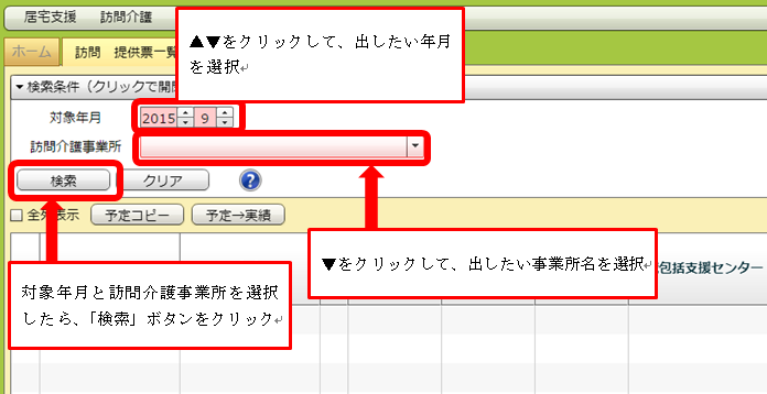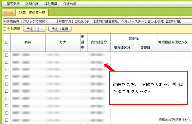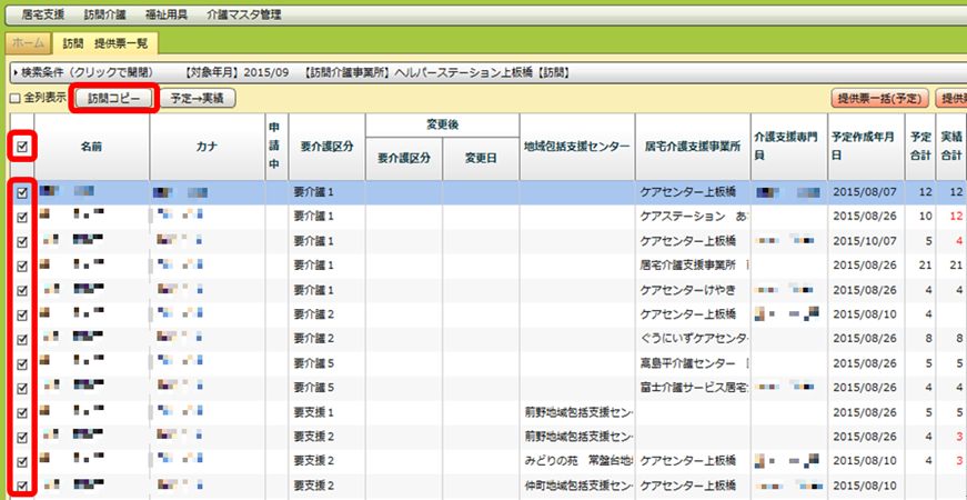 「名前」「カナ」などの項目名が書いてある列にあるチェックボックスをクリックすると、全件にチェックが入ります。その後「訪問コピー」ボタンを押すことで、チェックが入った全ての利用者の先々月の実績から今月の予定を作成することができます。