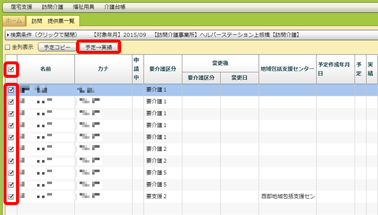 「名前」「カナ」などの項目名が書いてある列にあるチェックボックスをクリックすると、全件にチェックが入ります。その後「予定→実績」ボタンを押すことで、チェックが入った全ての利用者の予定をそのまま実績として登録できます。