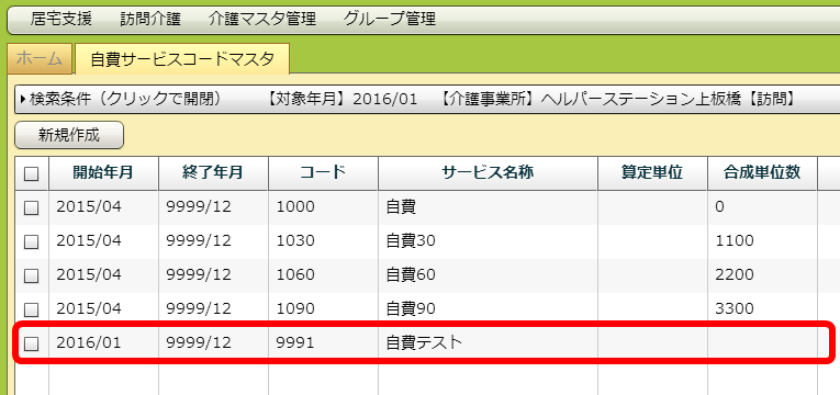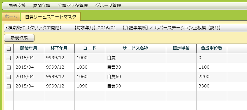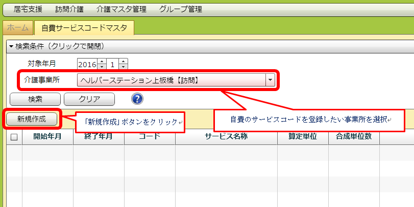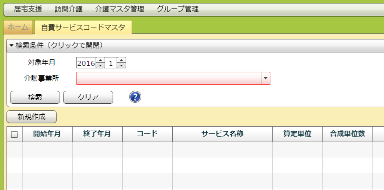 検索条件で自費のサービスコードを登録したい介護事業所を選択した後、検索画面の下にある「新規作成」ボタンをクリックします。