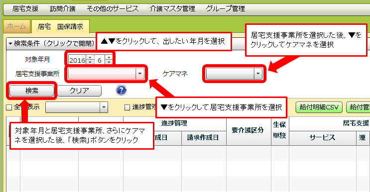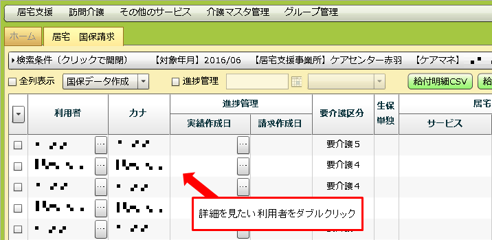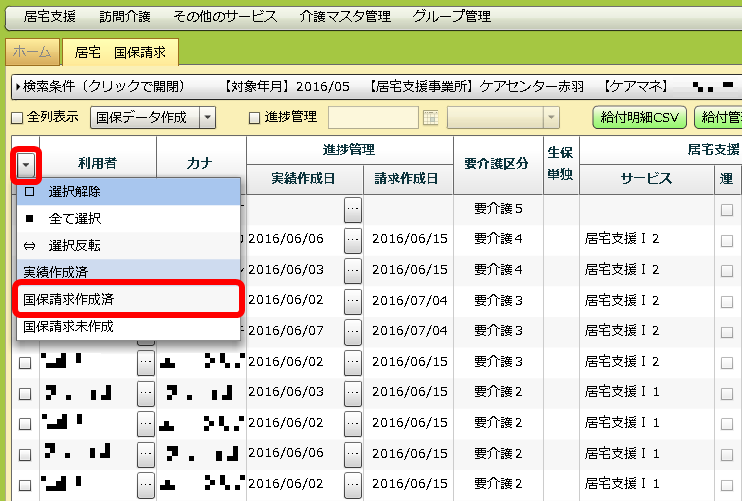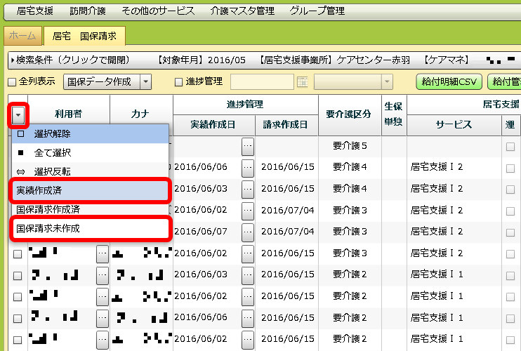 「名前」「カナ」などの項目名が書いてある列にある「▼」をクリックし、任意のものを選択してください。国保データ作成の際なら「実績作成済」か「国保請求未作成」、データ削除の際なら「国保請求作成済」を選択することが