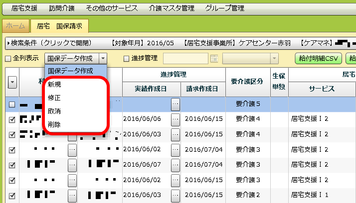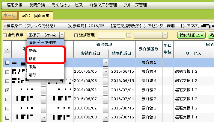「国保データ作成」をクリックし、「新規」「修正」「取消」「削除」からしたいことを選択してください。