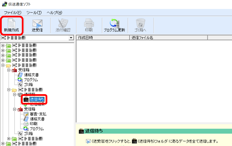 『国保データのCSV出力』を行いCSVの保存をした後、「国民健康保険中央会 伝送通信ソフト」を開きます。IDを選択し「送信待ち」を開き、「新規作成」から保存したCSVを選択します。