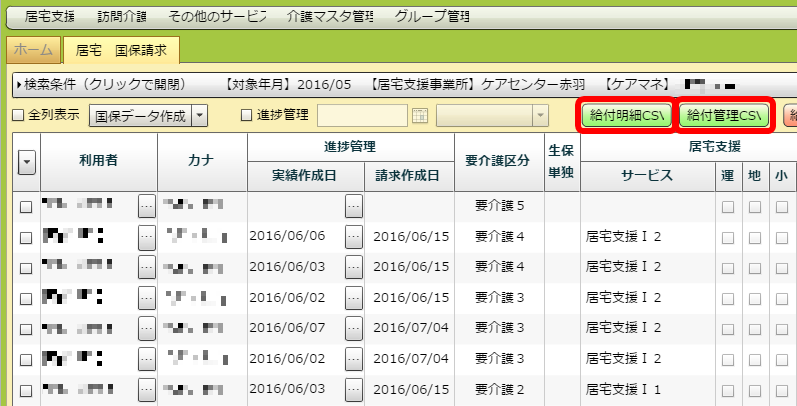 緑色の「給付明細CSV」「給付管理CSV」というボタンがあるので、出力したいCSVのボタンをクリックしてください。