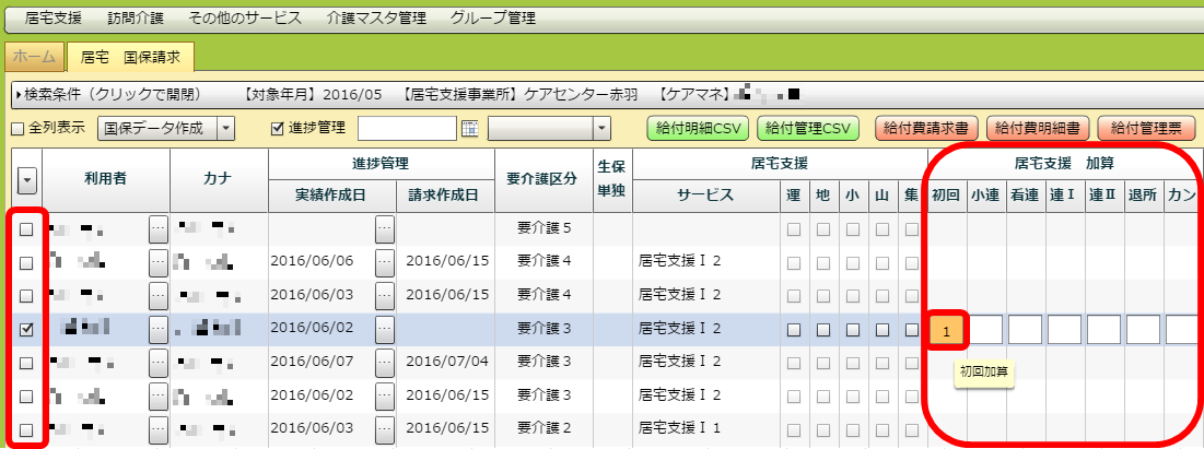 加算の列に「1」が入った状態で国保データを作成すると、その加算が入った状態の国保データが作成されます。