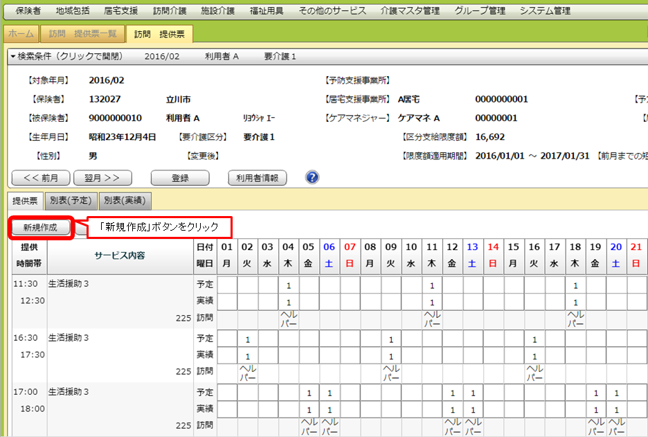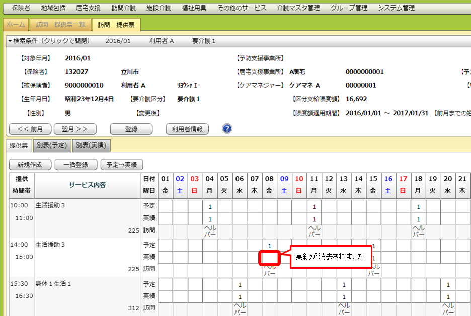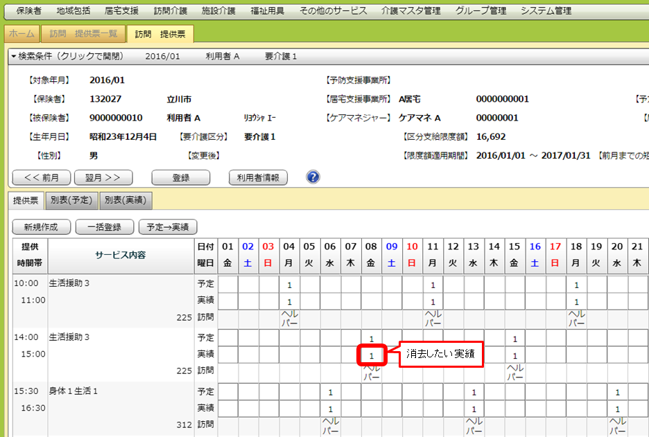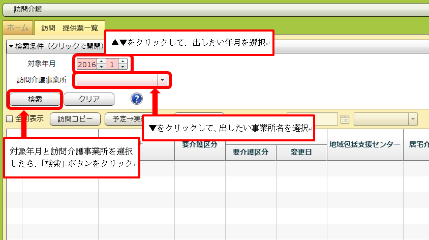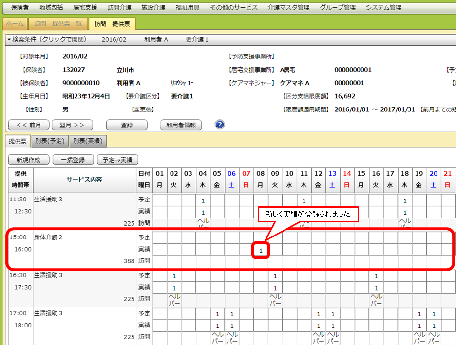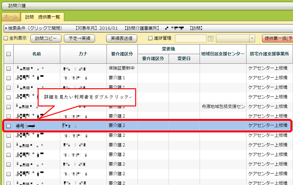検索条件を指定し、一覧画面を出します。実績を入力したい利用者をダブルクリックし、詳細画面を出します。