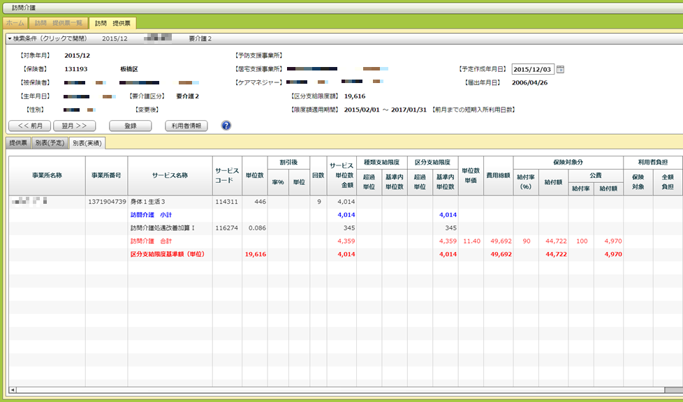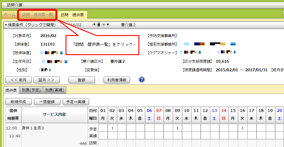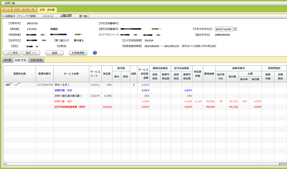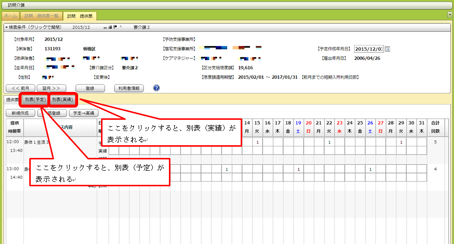 詳細画面 最初に開く提供票の他に、別表(予定)と別表(実績)を見ることもできます。