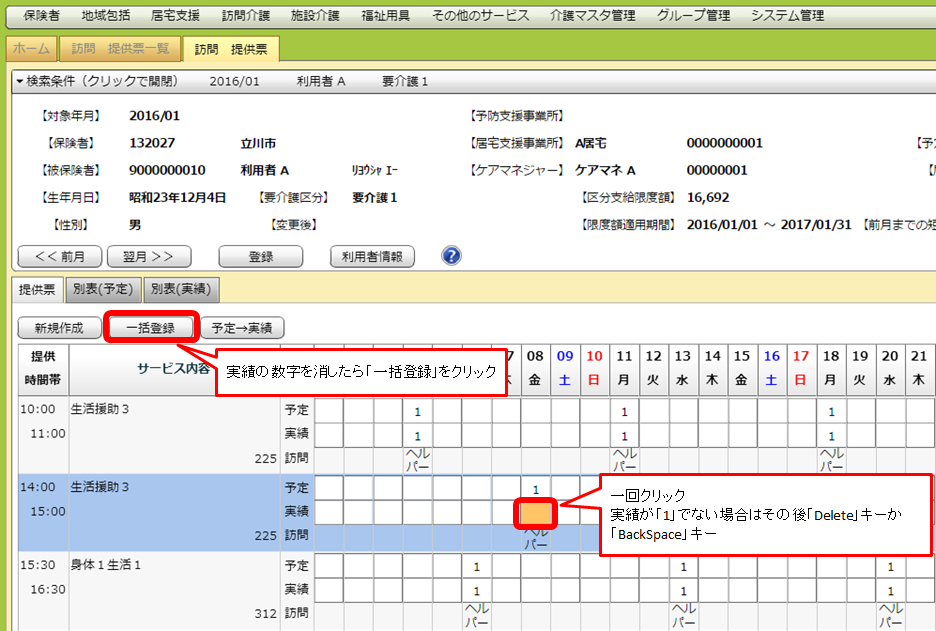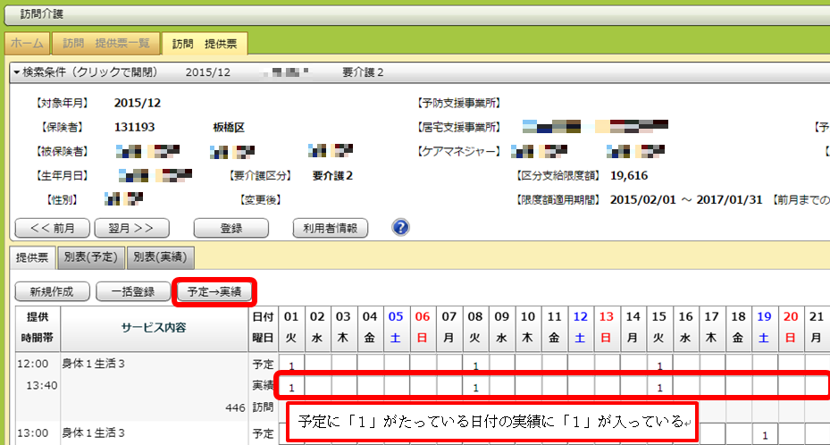 選択した後「予定→実績」ボタンをクリックすると、選択した利用者の予定がそのまま実績に入ります。