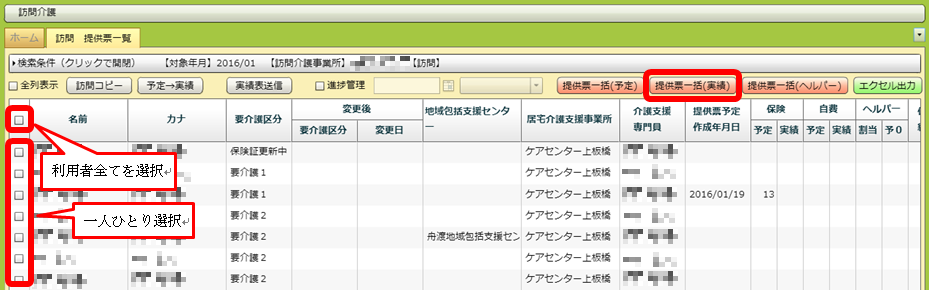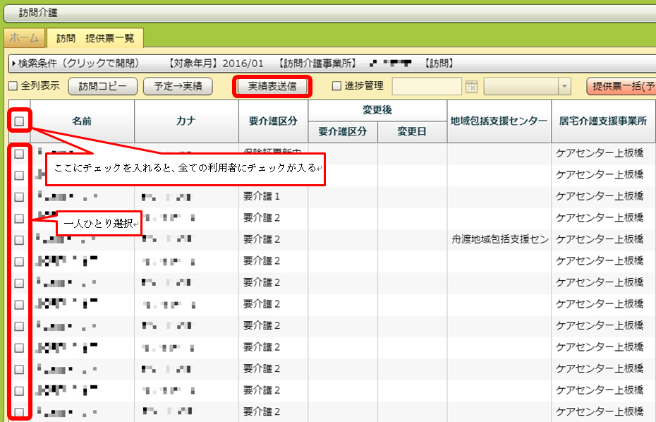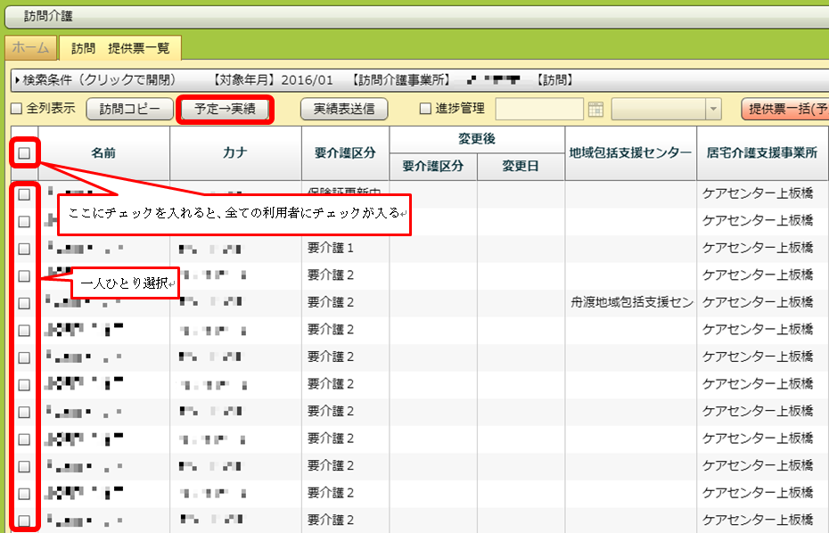 上でやった「予定→実績」を、一覧画面から一気に行うことができます。利用者全員を選択したい場合は、一覧の項目欄の一番左にあるチェックボックスをクリックしてチェックを入れます。
