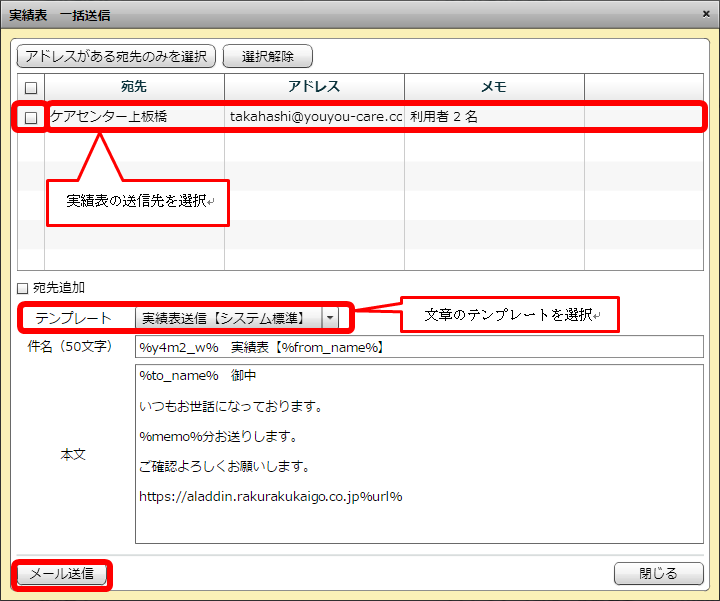事業所を選択し、その他確認した後は「メール送信」ボタンをクリックしてください。