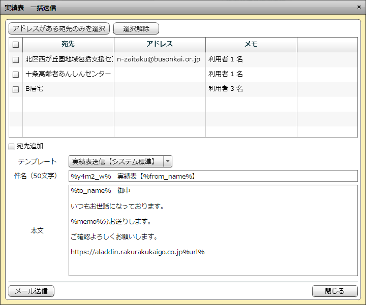 件名の「%y4m2_w%」には年月、【%from_name%】には送信元の事業所名が自動で入ります。
