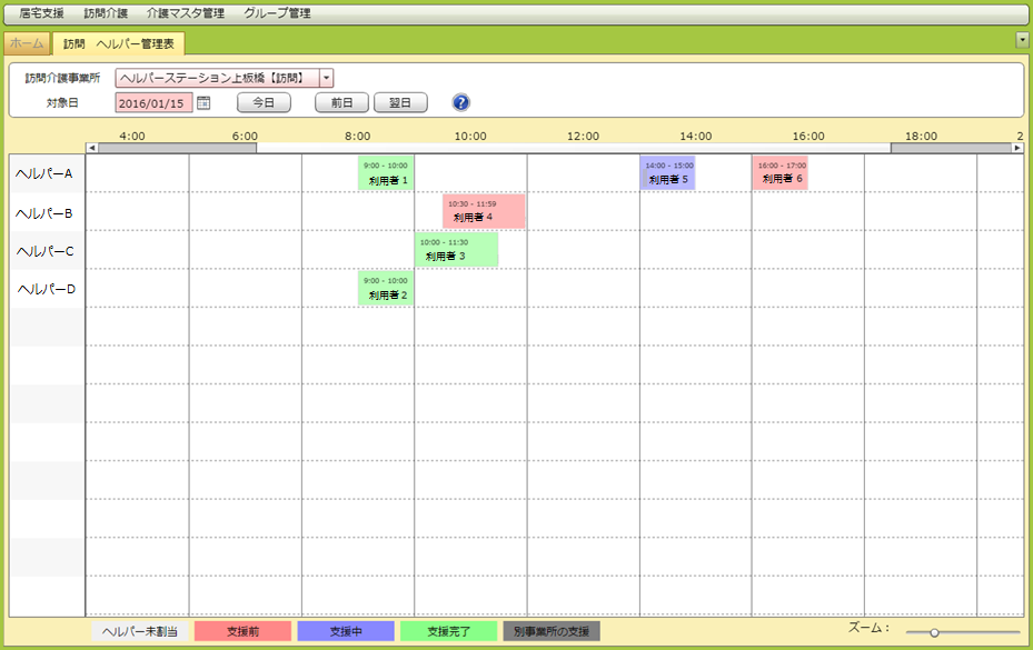 複数居宅への実績完了報告、活動時間表、ヘルパー管理票、訪問 提供票でのヘルパー名表示などの機能を今後追加していく予定です。複数居宅への実績完了報告