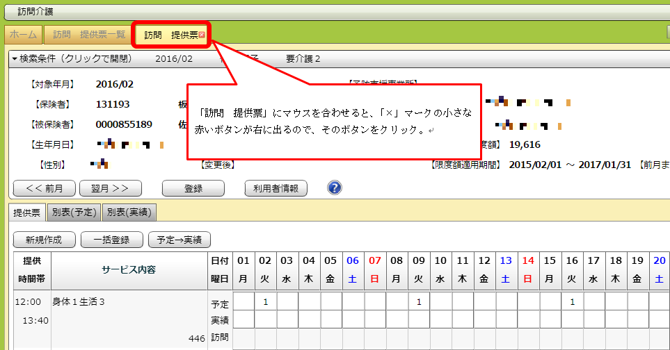 一覧画面に戻りたい場合は「訪問 提供票一覧」タブをクリックするか、今開いている詳細画面を閉じます。