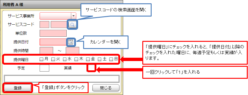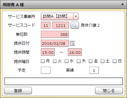 サービスコードや提供日付、提供時間など、予定と異なった箇所を変更してください。