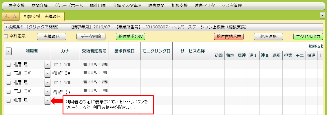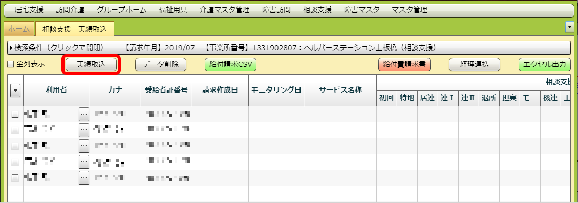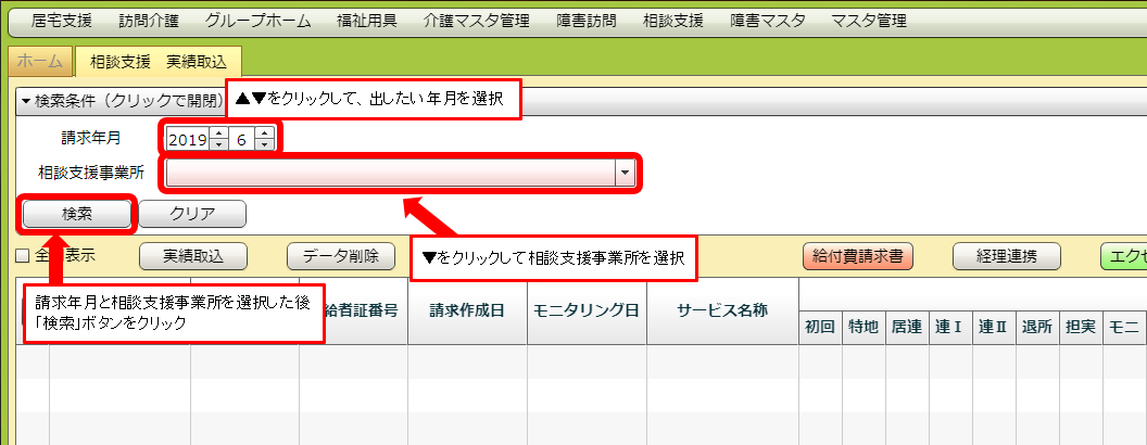 請求年月と事業所を指定して、相談支援の予定・実績が取り込み可能な利用者を検索できます。
