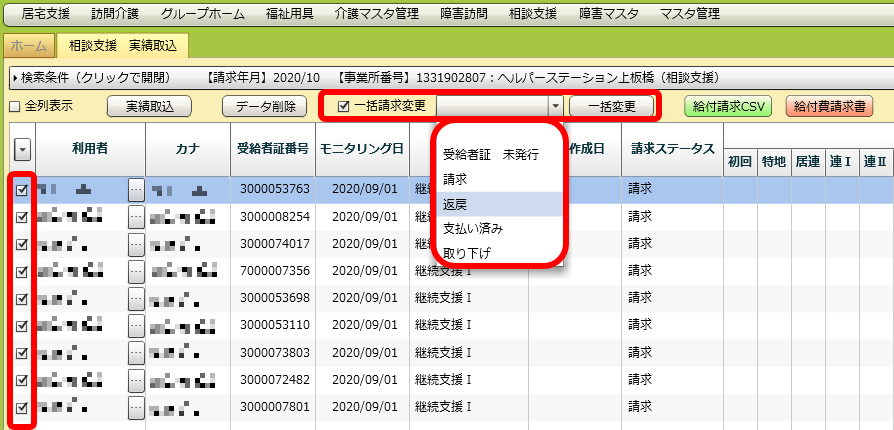 チェックを入れた利用者の請求ステータスが変更されました。