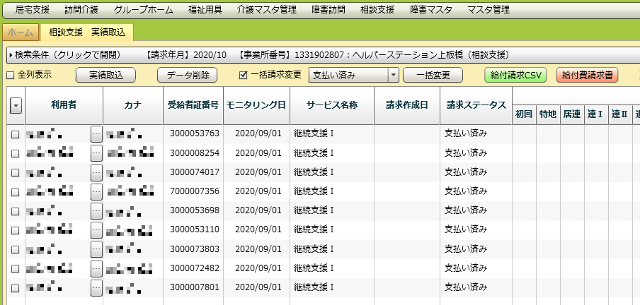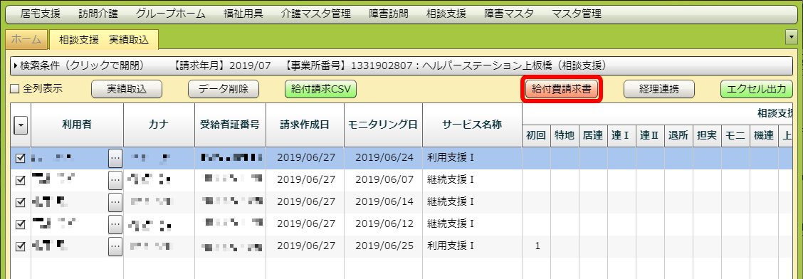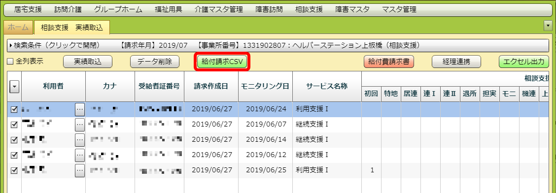 選択した利用者の分の、給付請求CSVが出力されます。