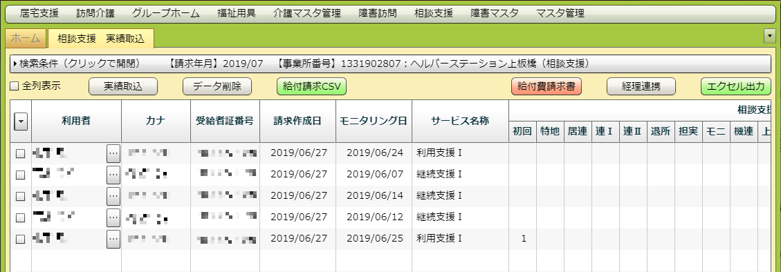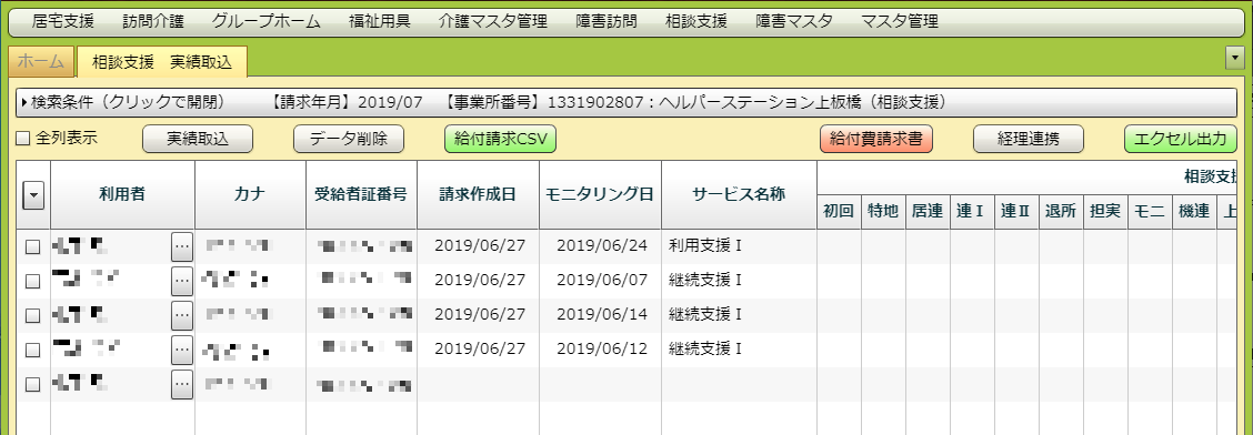 既に「相談支援 国保請求」で国保データを作成していたり、予定・実績を取り込んだりしていた場合はそのデータが表示されます。