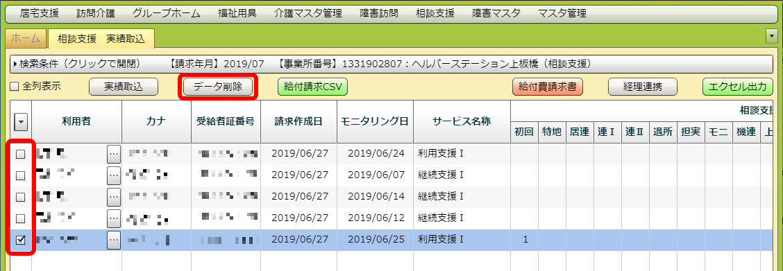 国保データを削除したい利用者にチェックを入れます。チェックを入れたら画面左上にある「データ削除」ボタンをクリックしてください。