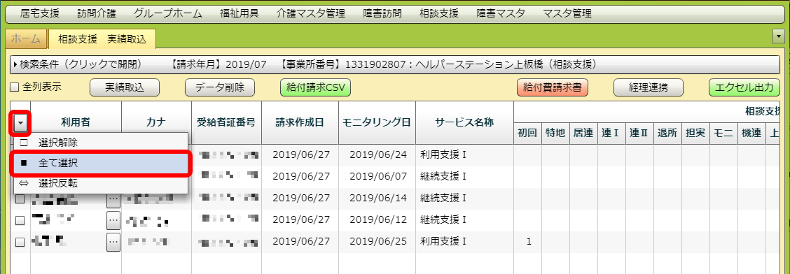 「利用者」「カナ」などの項目名が書いてある列にある「▼」をクリックし、「全て選択」をクリックしてください。または、チェックボックスを使ってデータを出力したい利用者を選択してください。