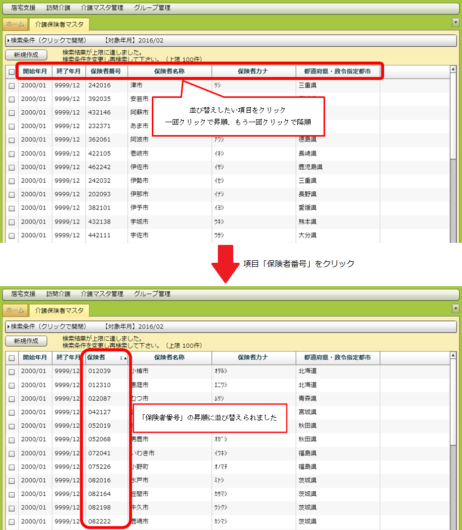 一覧画面で項目名をクリックすると、ソートができます。一回クリックで昇順に並び替え、もう一回クリックすると降順に並び替えられます。「Ctrl」キーを押しながらクリックすれば、複数の項目でソートできます。