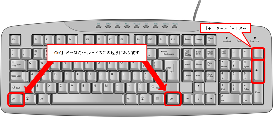 キーボードの「Ctrl」キーを押しながら「+」キーを押すと拡大ができ、「-」キーを押すと縮小ができます。