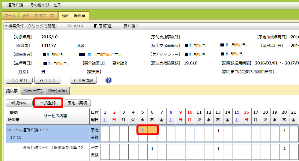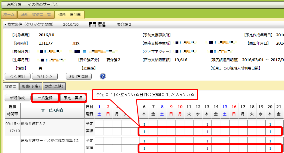 「予定→実績」ボタンをクリックしてから「一括登録」ボタンをクリックすると、予定を実績としてそのまま登録できます。「1」ではなく「3」などが予定に立っている場合は、実績の方にもきちんと「3」で入ります。