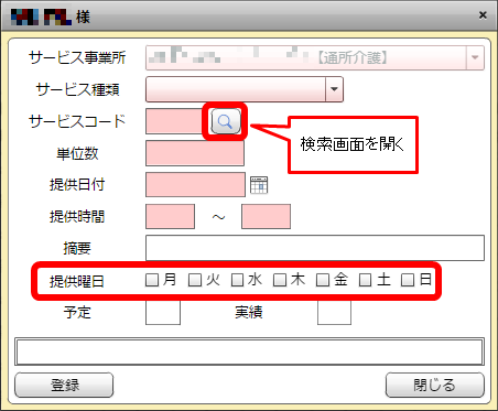 「提供曜日」にチェックを入れると、「提供日付」以降の選択した曜日に毎週予定、または実績が登録されます。