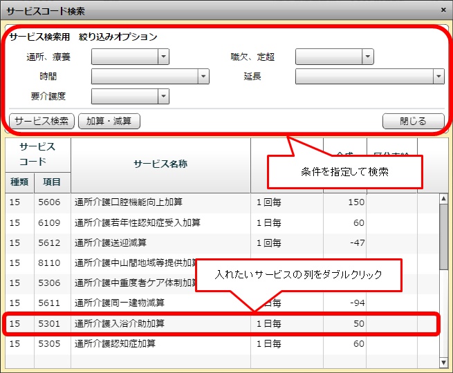 加算・減算以外のサービスを検索する場合は、プルダウンで検索条件を設定してください。