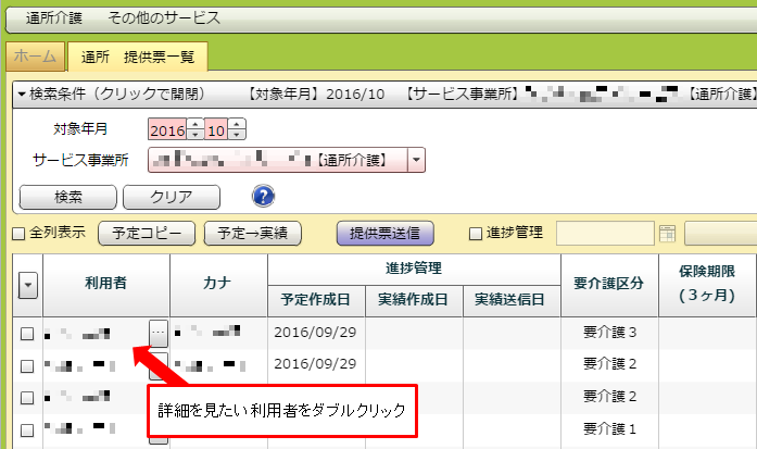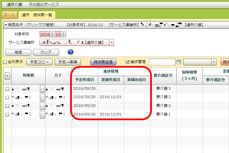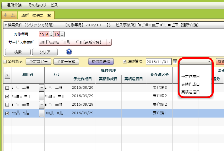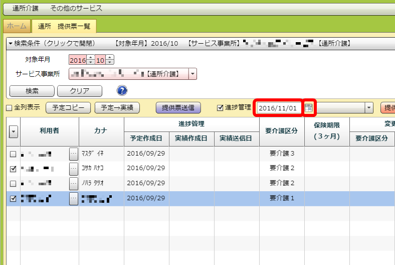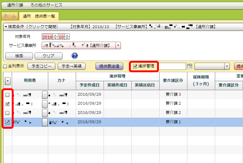 「予定作成日」「実績作成日」「実績送信日」のいずれかを登録したい利用者のチェックボックスにチェックを入れてください。その後、「進捗管理」にチェックを入れてください。