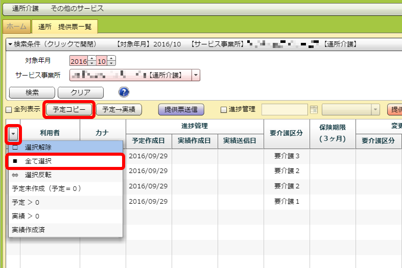 その後「予定コピー」ボタンを押すことで、チェックが入った全ての利用者の先々月の実績から今月の予定を作成することができます。