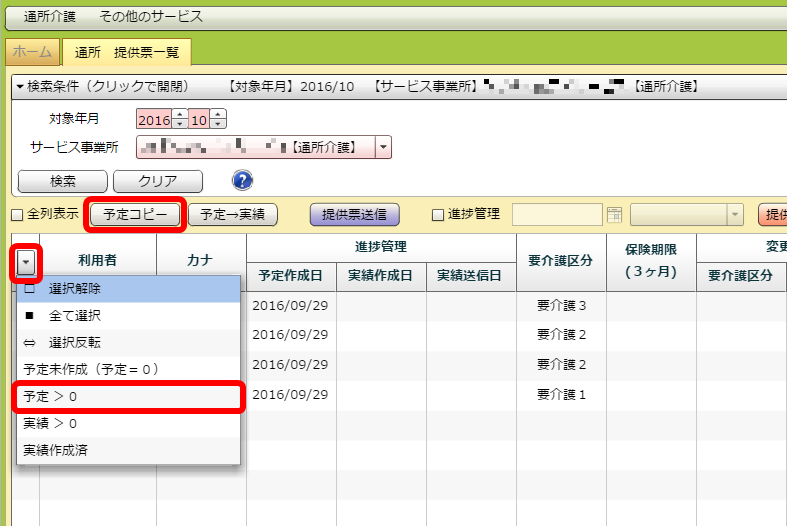 「名前」「カナ」などの項目名が書いてある行にある「▼」をクリックし、「予定 > 0」をクリックしてください。予定の入っている利用者のみにチェックがつきます。