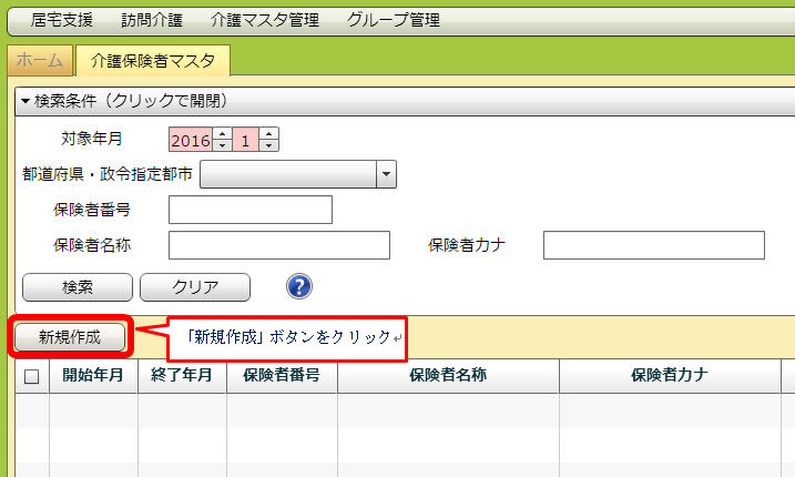検索画面の下にある、「新規作成」ボタンをクリックします。
